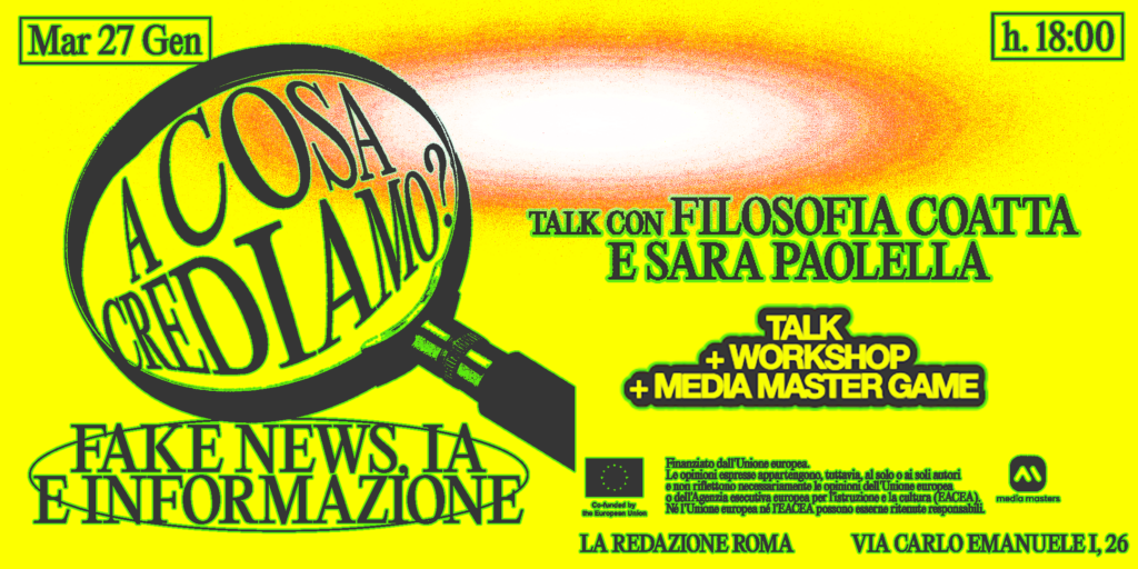 L’evento si tiene presso laRedazione di Scomodo ed è dedicato all’educazione ai media e al pensiero critico, con un focus specifico sul tema delle fake news e delle tecniche di manipolazione dell’informazione.