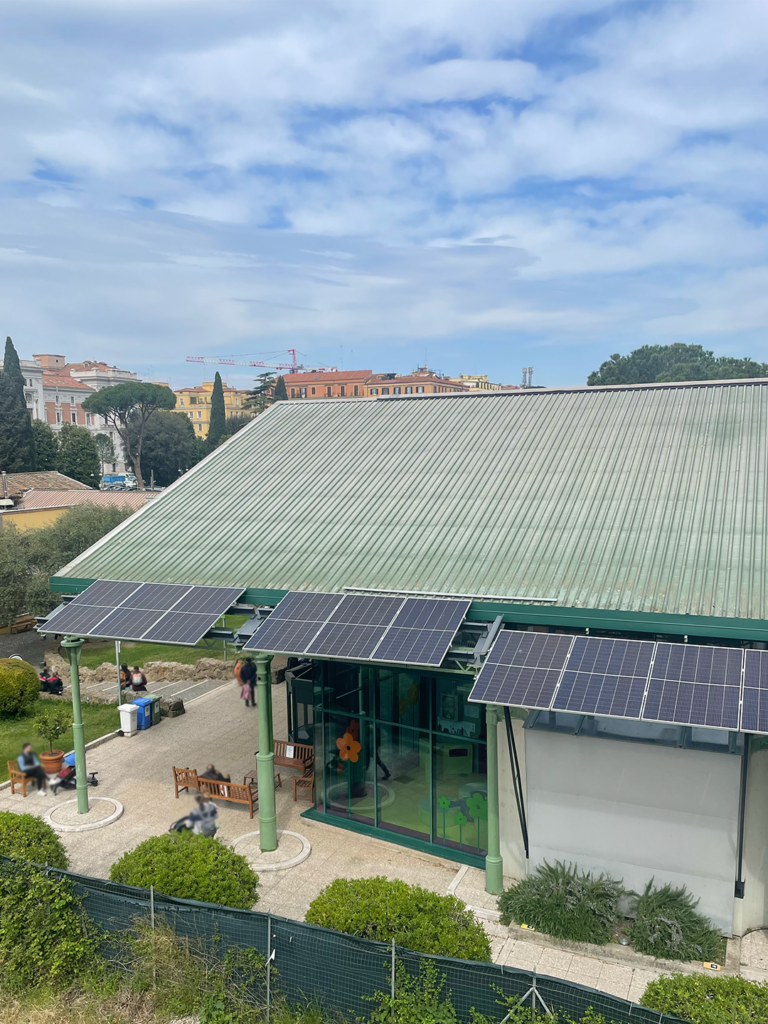 - Nuovo Impianto fotovoltaico di 62 kWp che ha di fatto “rivampato” i due precedenti impianti oramai obsoleti (di 15 kWp del 2001 Progetto europeo DG Energie e 17,5 kWp del 2007 primo incentivo GSE) riunendo la potenza su 1 POD unico ovvero quello del padiglione espositivo. L’impianto, Trifase BT/MT ,è costituito da una sezione da 40 kWp su pensilina di parcheggio auto e una sezione da 22 kWp su frangisole con un’aspettativa di produzione di 77.000 kWh/anno in autoconsumo totale con l’obiettivo di ridurre la spesa energetica. I 100 pannelli installati sono del tipo 3SUN 3SHBGH-C da 620 Wp in silicio cristallino, 610-640 W , con un’efficienza del modulo > 21.6% (fino al 22,6%), bifacciale al 90% (fattore di bifaccialità), Classe A, inserito nell’elenco ENEA del “Registro delle tecnologie per il fotovoltaico” e progettato e realizzato in Italia. La stima è di vedere la spesa ridotta di oltre il 30%/anno.